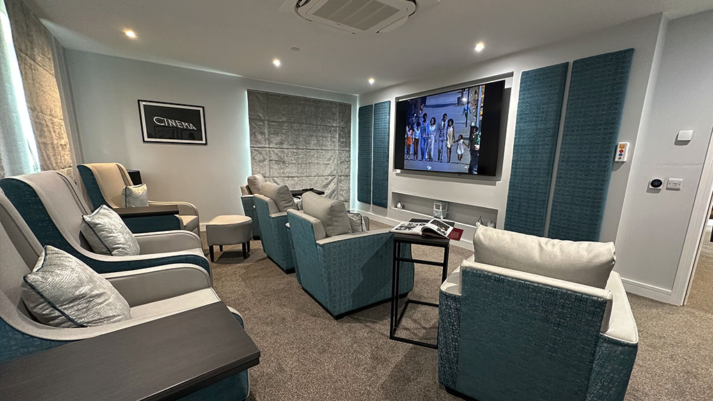 We were commissioned to deliver a complete audio-visual installation across Cheadle Grange Care Home, encompassing large-format commercial displays for the communal lounges and a luxurious cinema room.