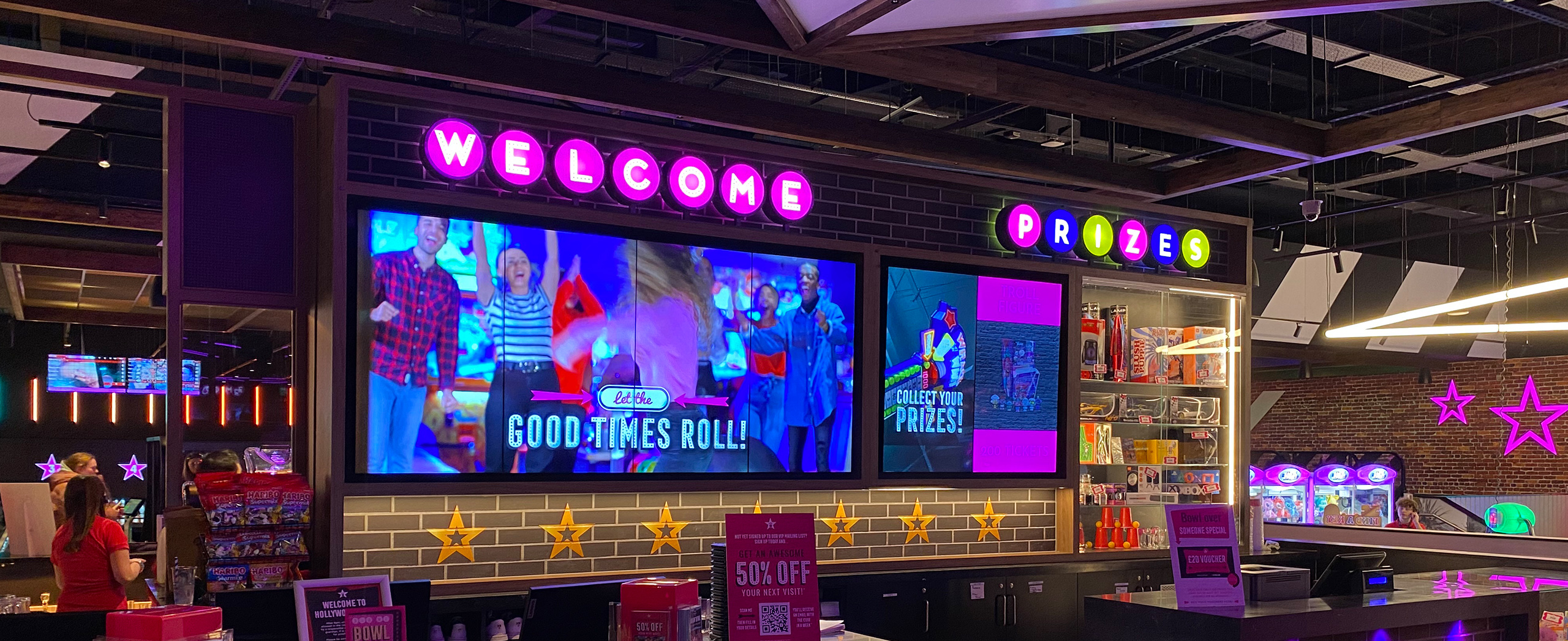 The remaining 2 x Philips 49-inch screens were used for bowling scoreboards, one next to the selfie wall with the classic first, second and third podium and the other at the end of the bar allowing everyone in the building to see who has the highest scores out of all the bowling games being played.