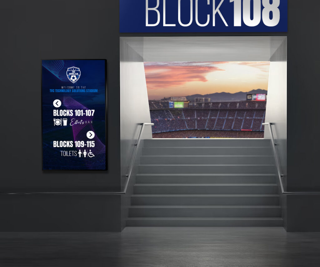 Located throughout concourses, hospitality areas, and fan zones, digital signage keeps supporters engaged and informed from entry to exit. It also offers valuable advertising space for sponsors, generating additional revenue streams.
